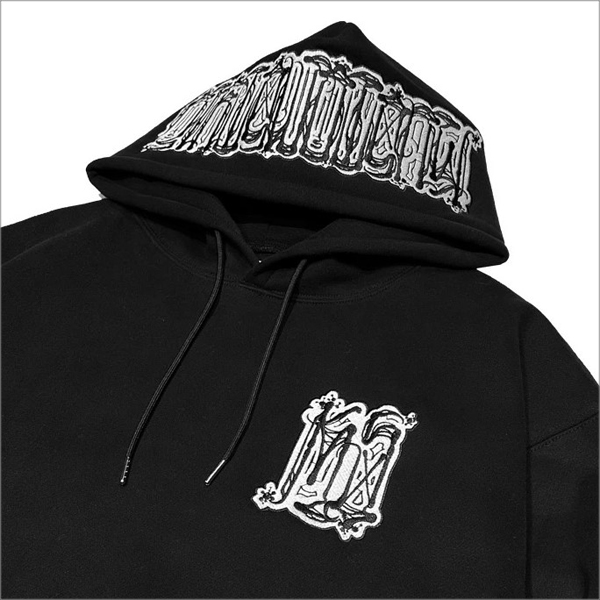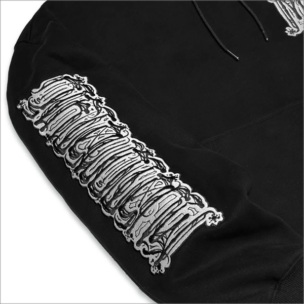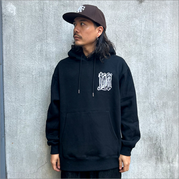 左胸や右袖、フード部分に刺繍の入った裏起毛のパーカー